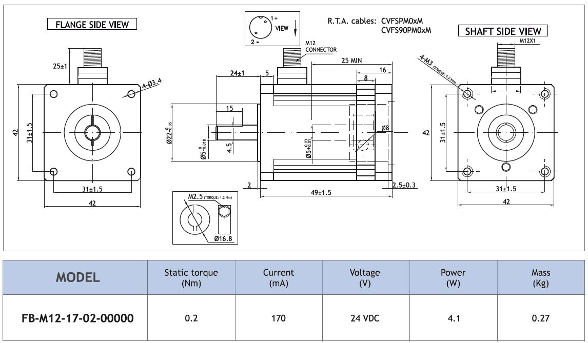 The FB-M12-17-02-00000 is an electromagnetic holding brake, that perfectly couples with NEMA 17 flange R.T.A. stepping motors, with or without encoder, and combo units.